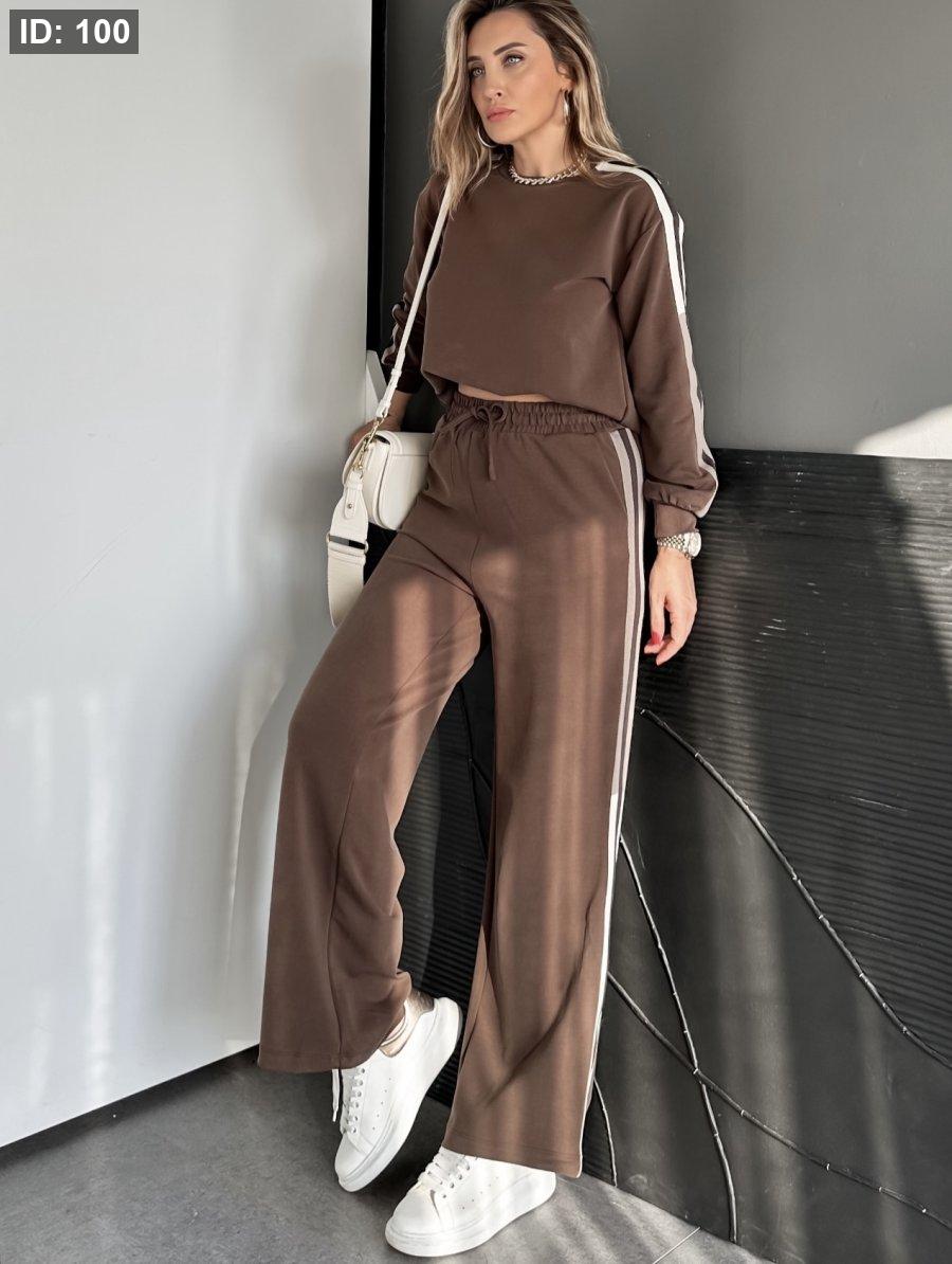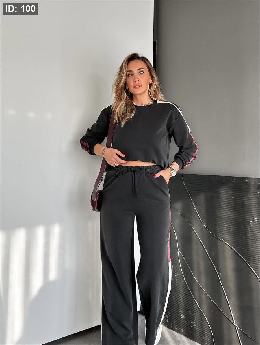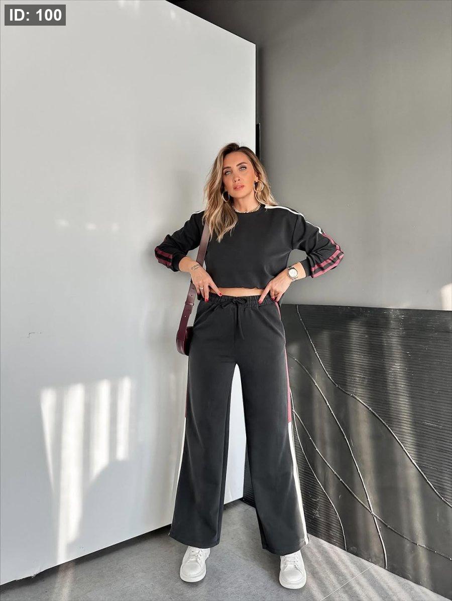 طقم سبور عصري من قطعتين، بلوزة كروب سوداء بقصّة مريحة مع خطوط جانبية بلون خمري تعطي ستايل ستريت فايف، منسّقة مع بنطلون واسع بخصر مطاطي وخطوط جانبية مطابقة. اللوك كاجوال، أنيق، ومناسب للطلعات اليومية مع لمسة أنثوية قوية