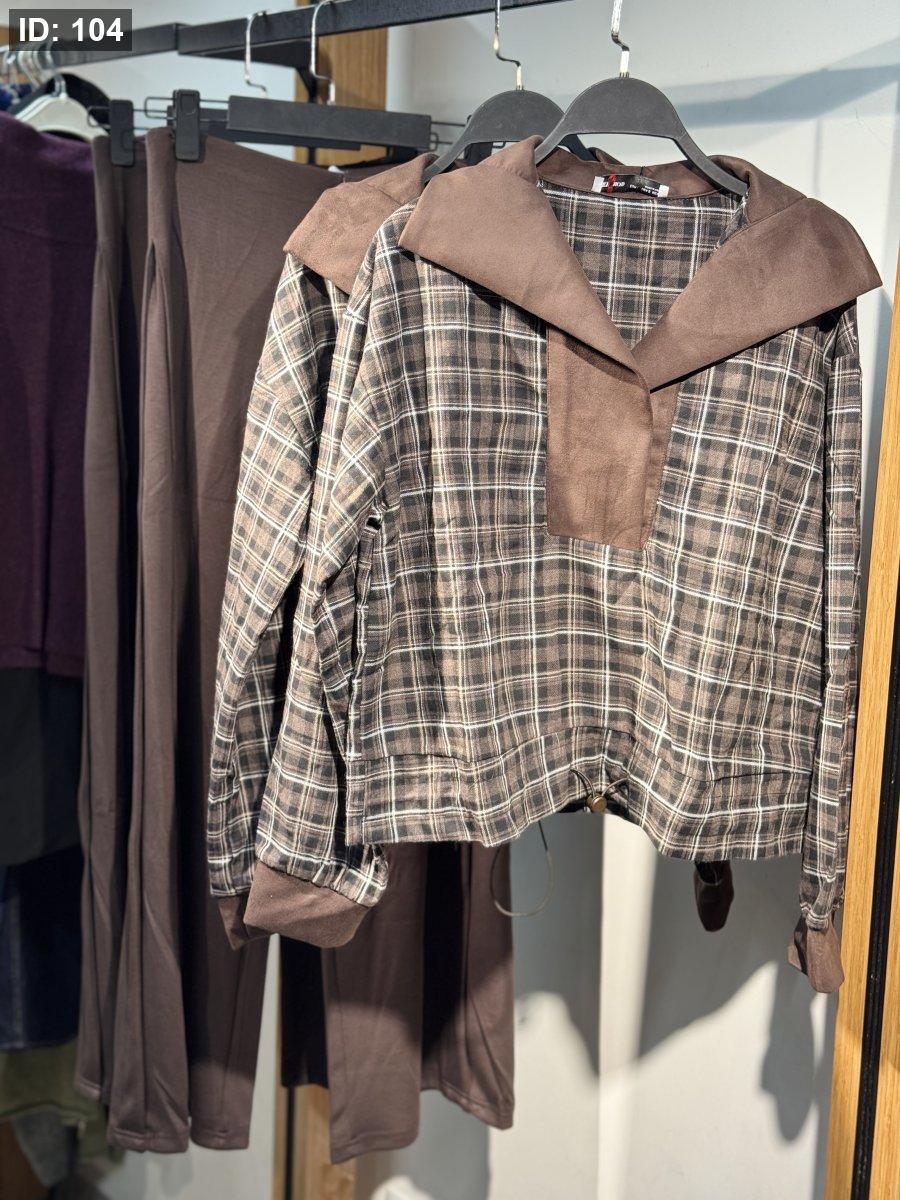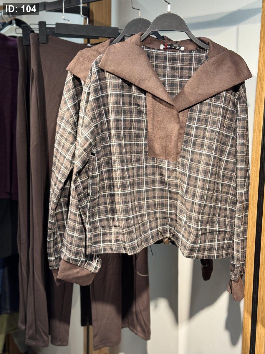 طقم مريح بنقشة كارو بني، بلوزته بقبة سيلور واسعة من خامة فوتر ناعمة تعطي لمسة دافئة ومختلفة، مع أكمام فيها تفصيل كُف بني يكمّل اللوك. منسّق مع بنطلون بسيط بلون بني سادة لستايل كاجوال مرتب ومريح للطلعات اليومية