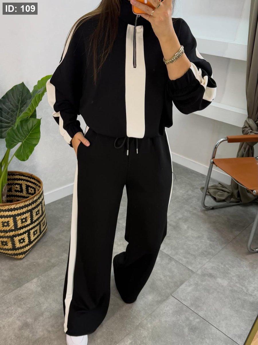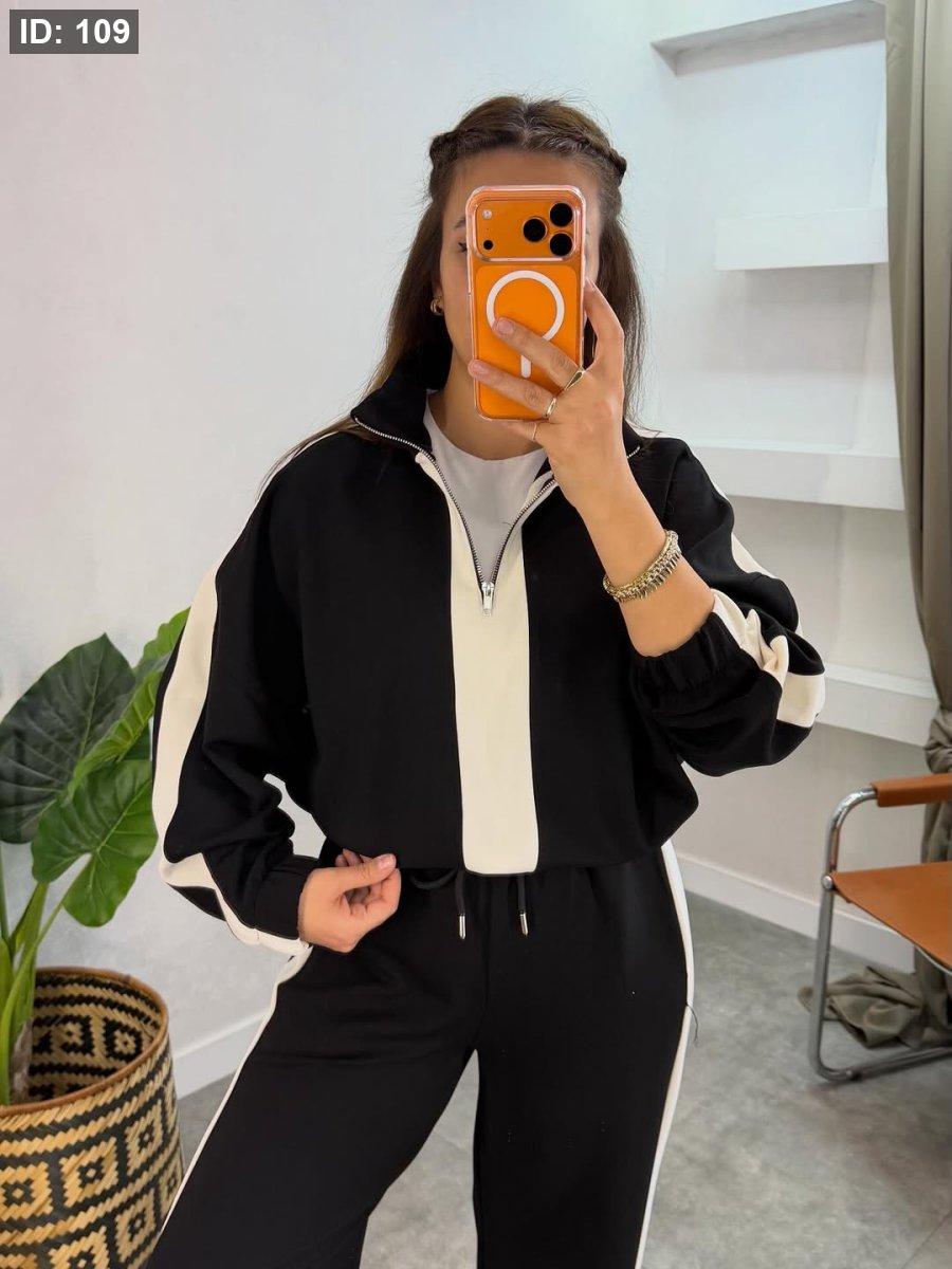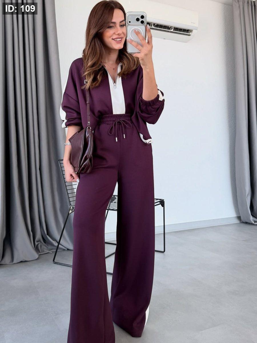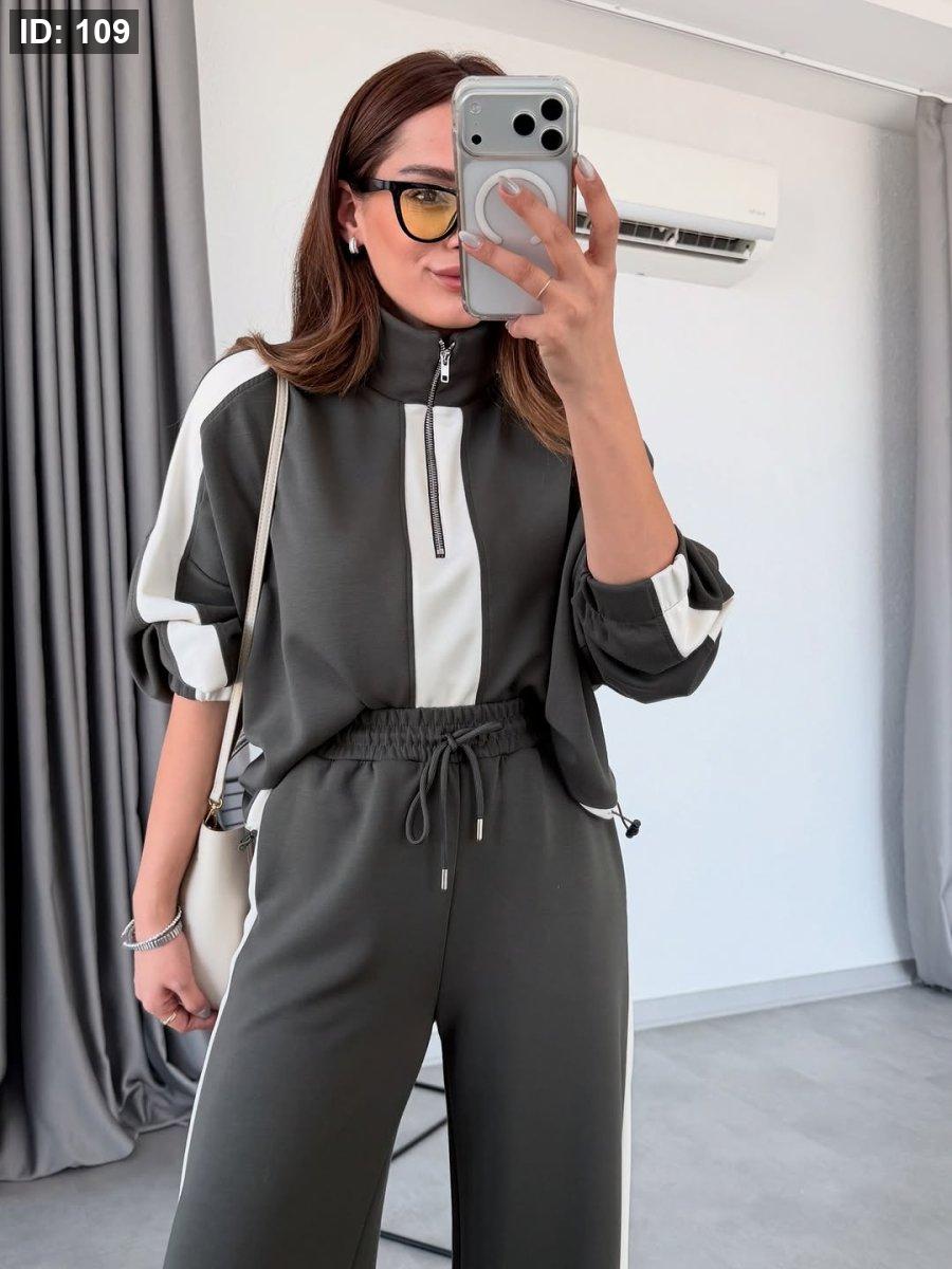 ترينج ناعم ومريح من قماش القطن، بيجي بسحاب لحد القبة العالية. فيه خط واضح بالوسط للمسة ستايل مرتّبة، ومع خط جانبي على البنطلون بيعطيه شكل رياضي أنيق. مناسب للبس اليومي والطلعات الخفيفة