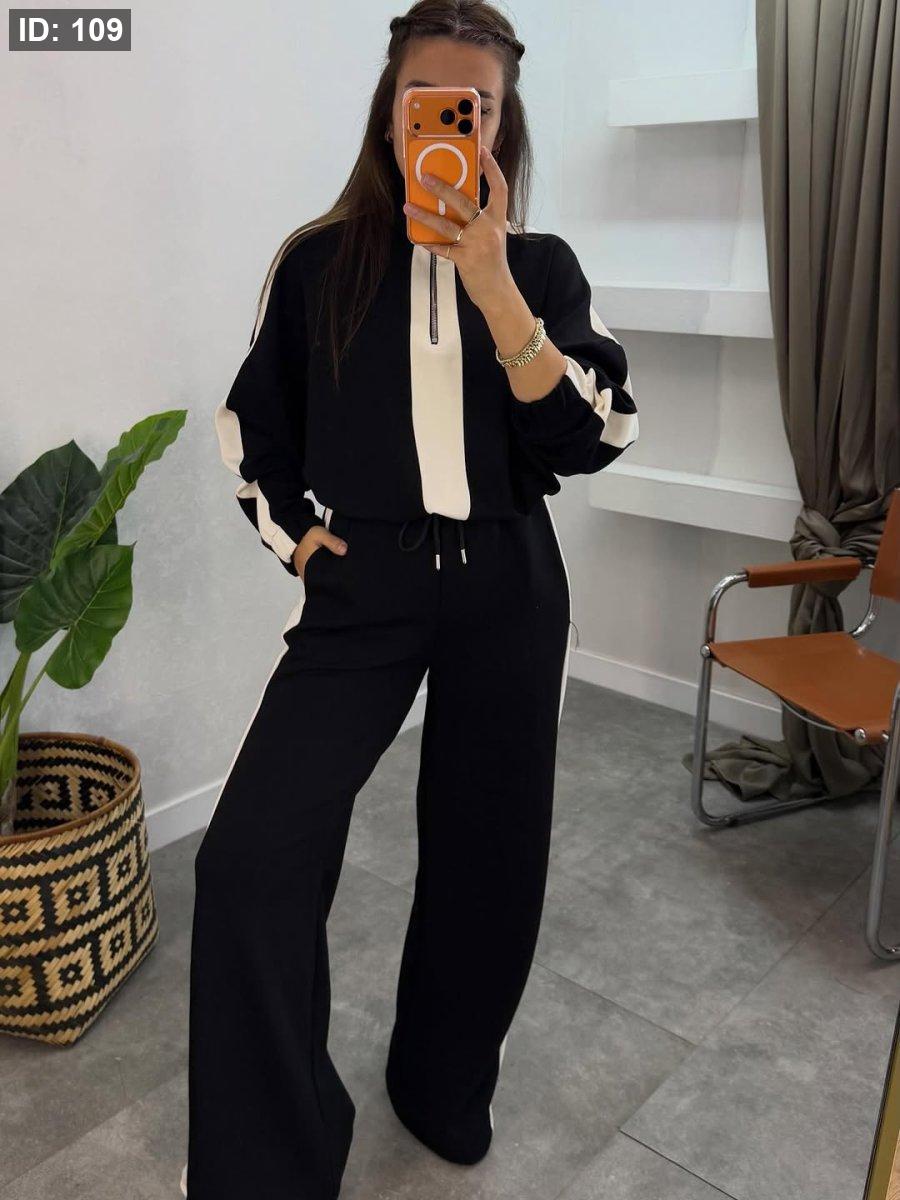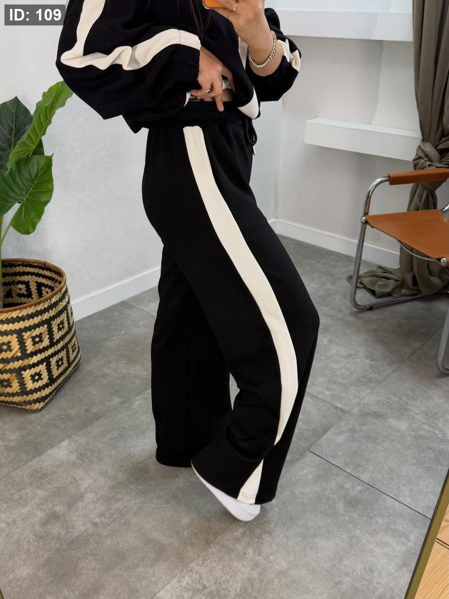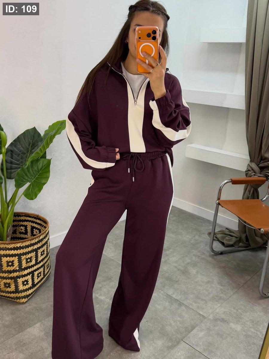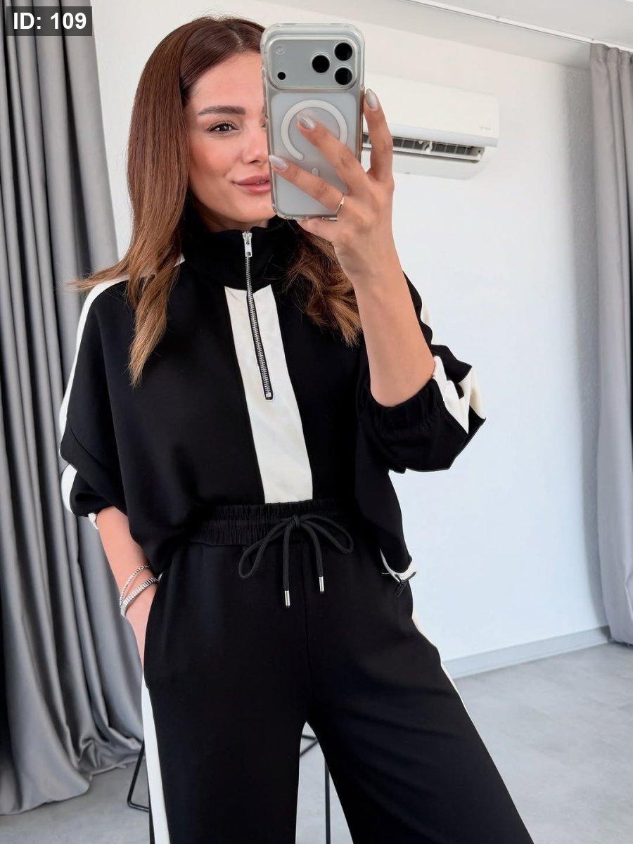ترينج ناعم ومريح من قماش القطن، بيجي بسحاب لحد القبة العالية. فيه خط واضح بالوسط للمسة ستايل مرتّبة، ومع خط جانبي على البنطلون بيعطيه شكل رياضي أنيق. مناسب للبس اليومي والطلعات الخفيفة