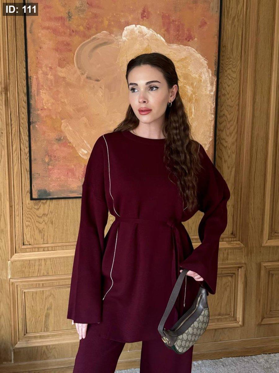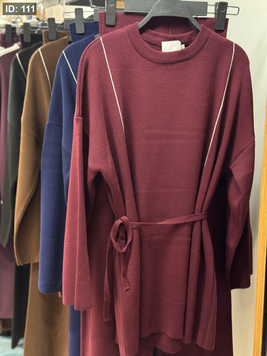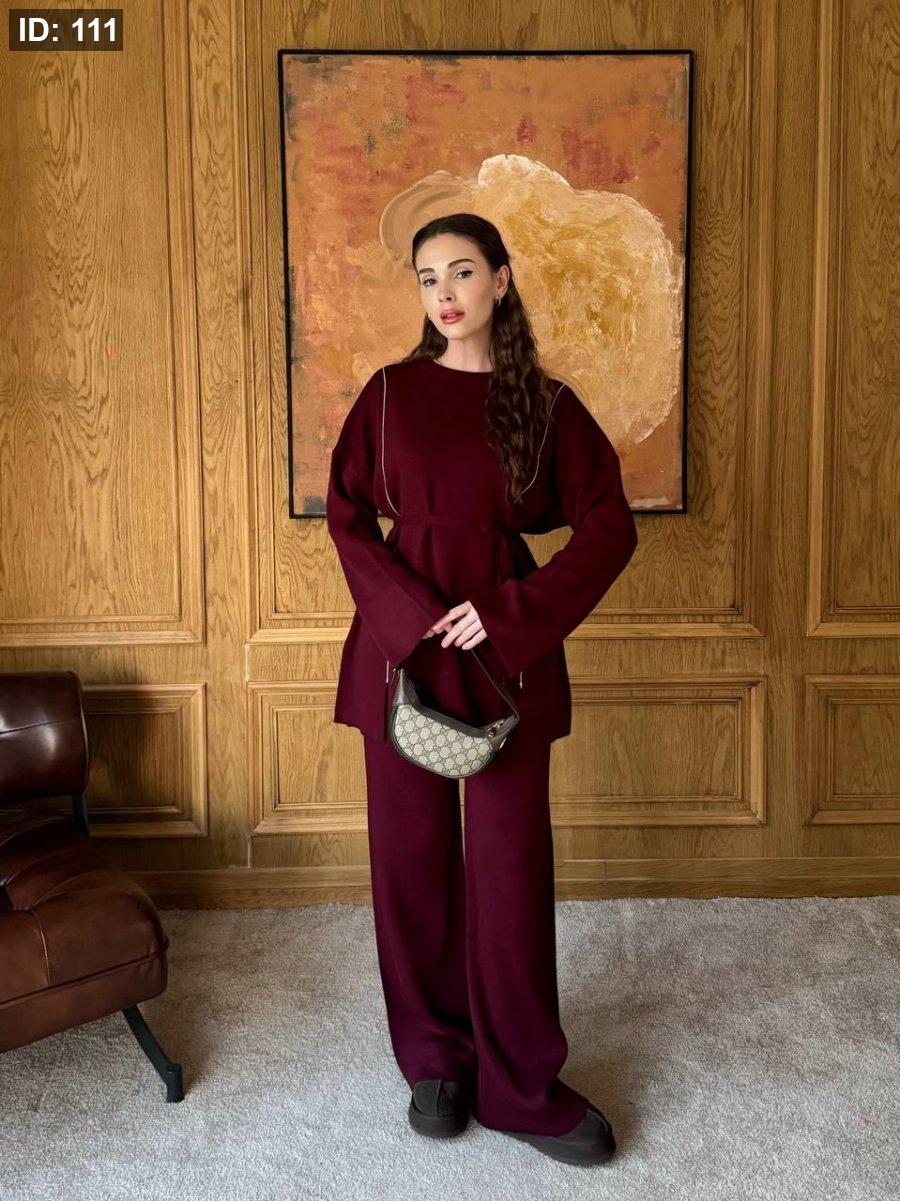طقم صوف ناعم بلمسة دفا وأنوثة، بيجي بخطّين رفاع وطوال على الواجهة لإطلالة مرتّبة وجذّابة. قصّته بسيطة بس ملفتة، وبيعطي شكل أنيق سواء للّبس اليومي أو الطلعات الخفيفة