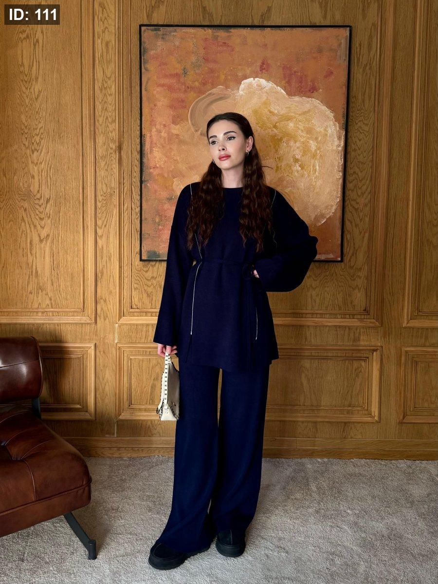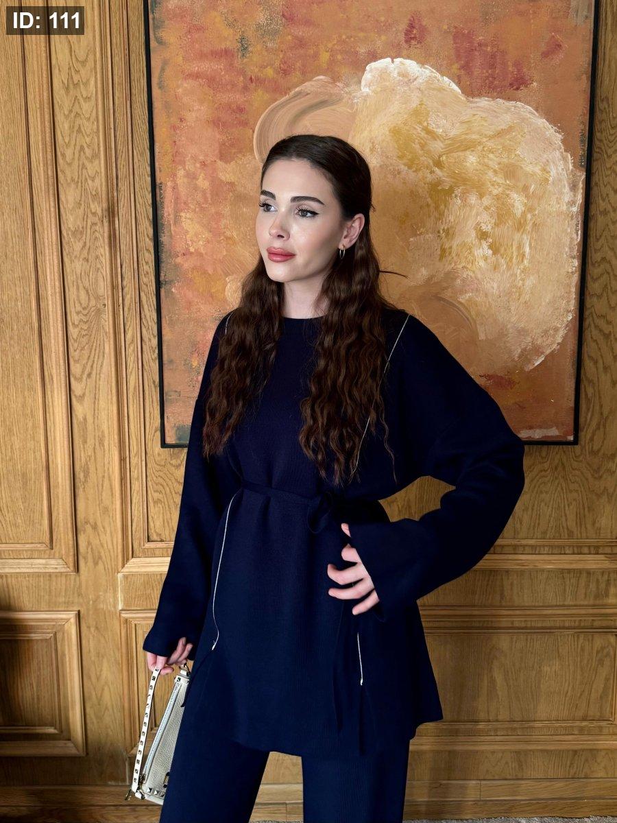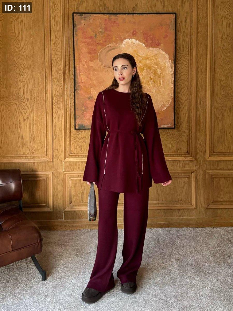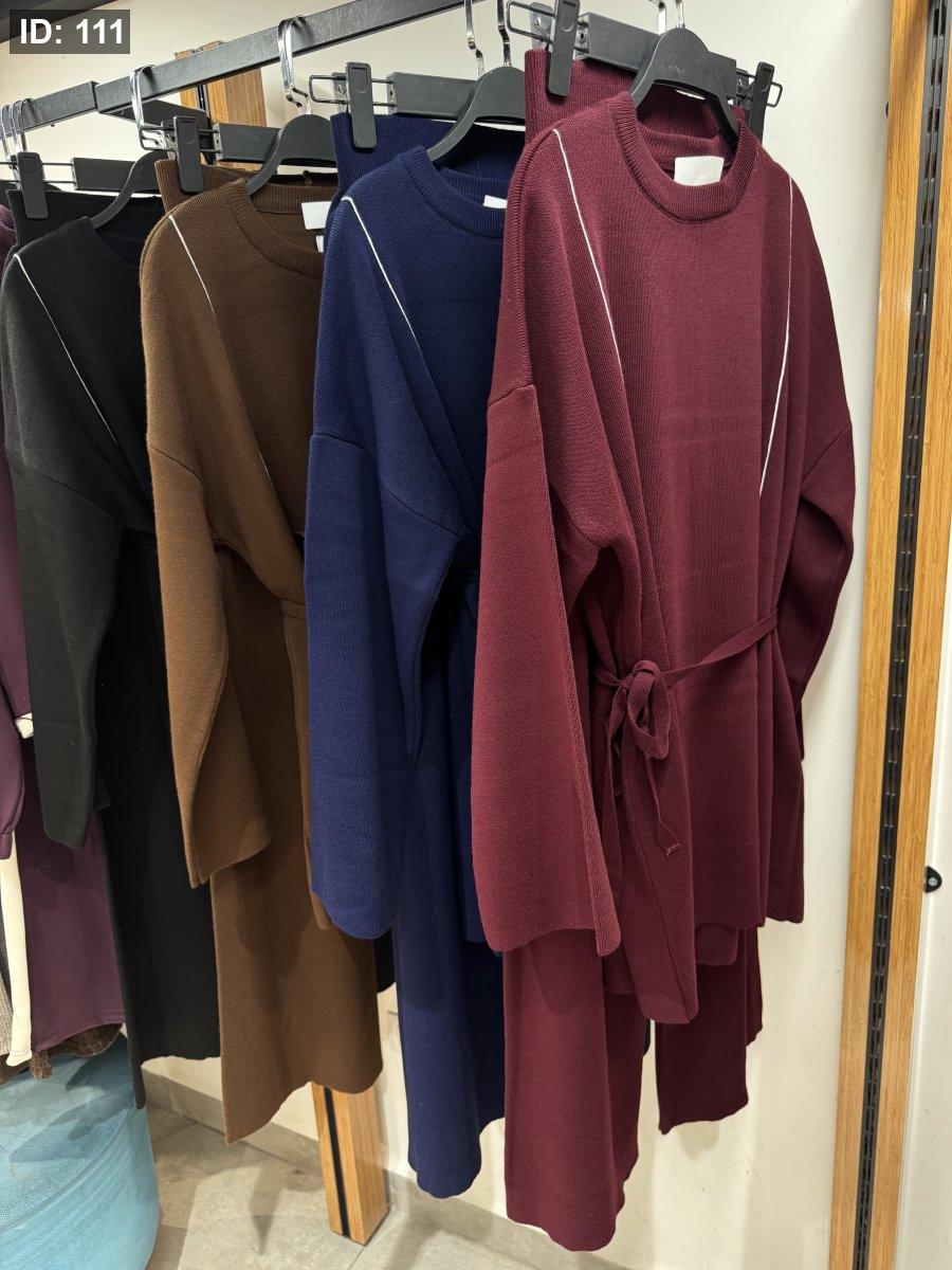 طقم صوف ناعم بلمسة دفا وأنوثة، بيجي بخطّين رفاع وطوال على الواجهة لإطلالة مرتّبة وجذّابة. قصّته بسيطة بس ملفتة، وبيعطي شكل أنيق سواء للّبس اليومي أو الطلعات الخفيفة