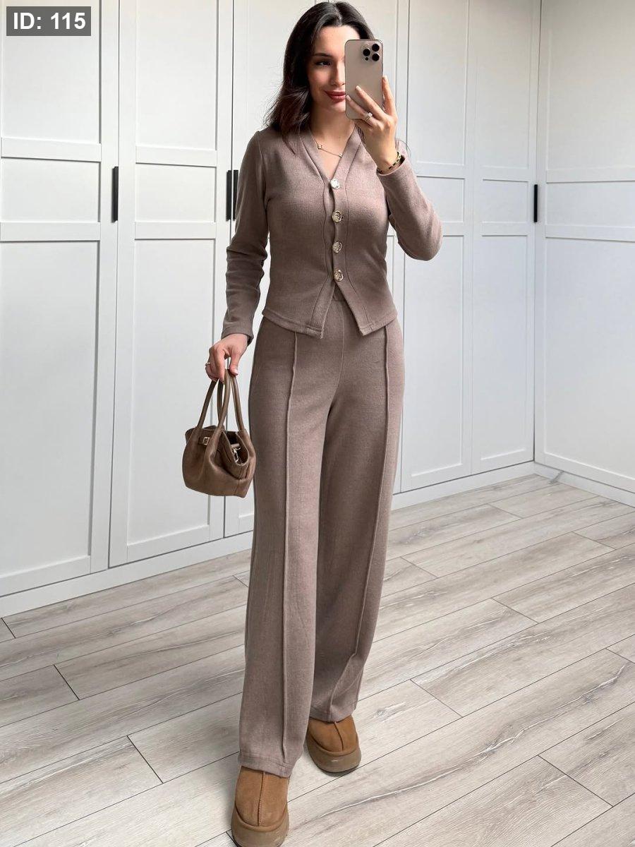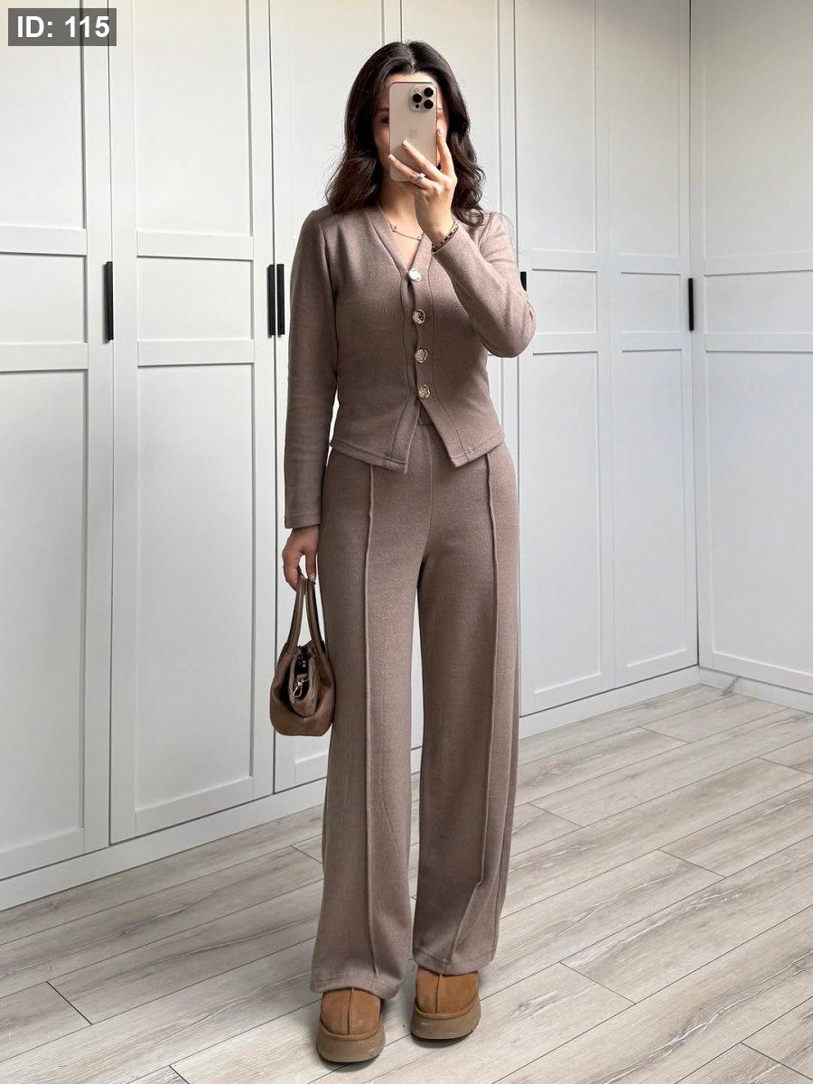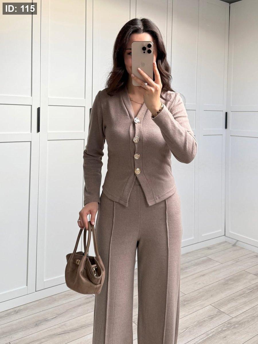 طقم صوف ناعم من زارا، بيمتاز بأربع زرارات مرتّبين بالوسط لمسة فخمة وبسيطة. قصّته مفصّلة على الجسم مع خصر مشدود بيعطي شكل أنيق ومرتّب. قطعة ستايلش وهادية، مثالية للّبس الراقي والطلعات المميزة