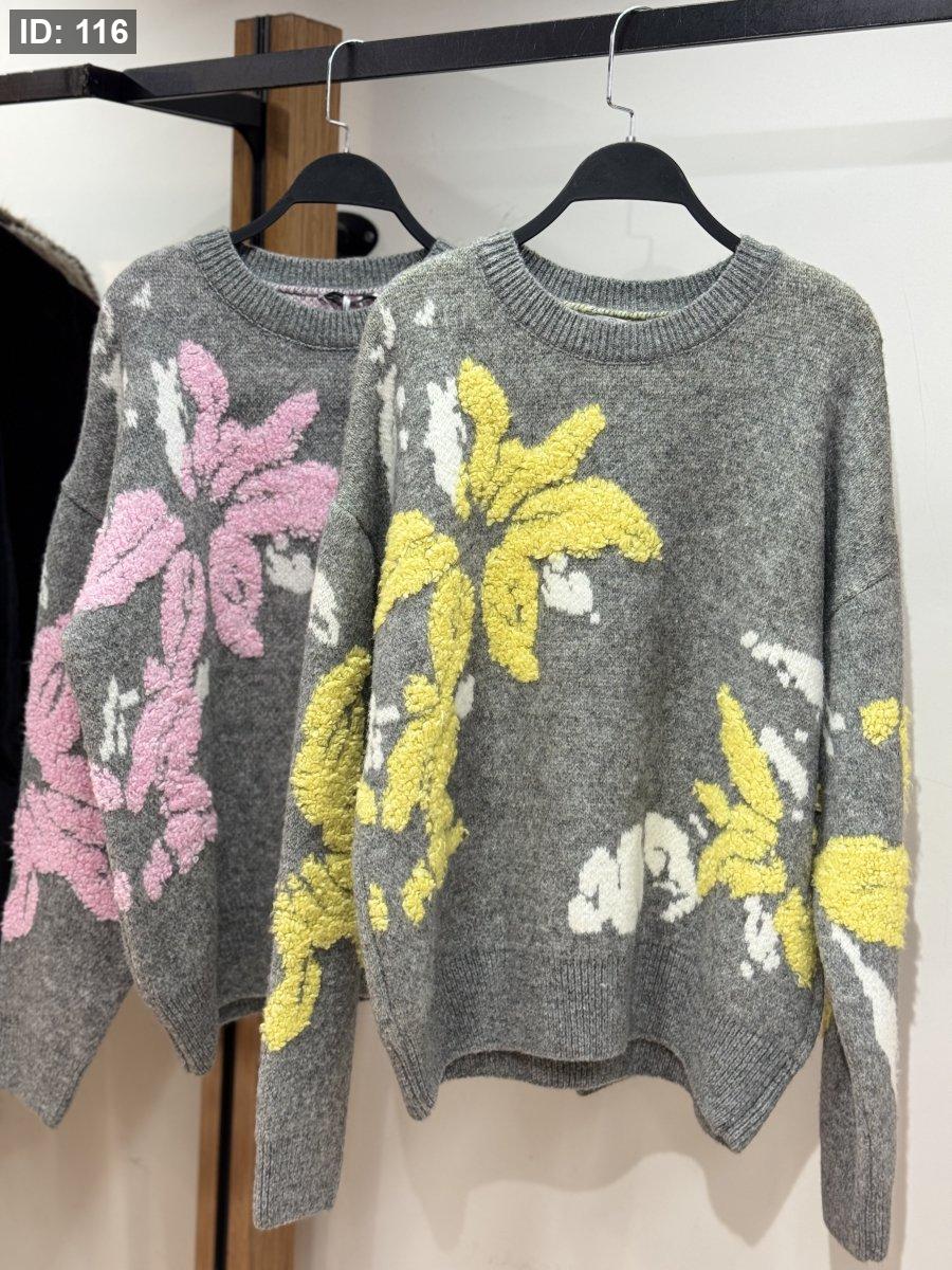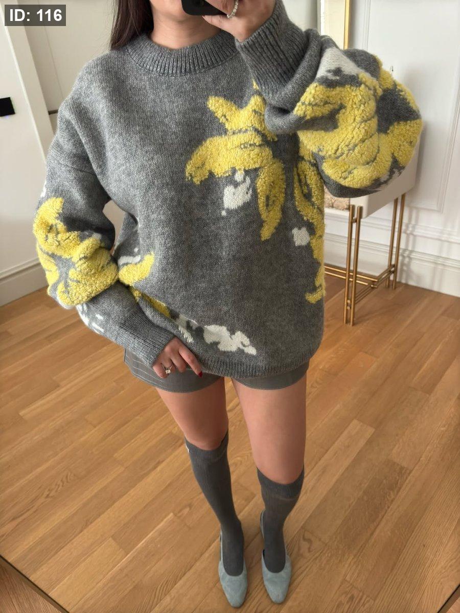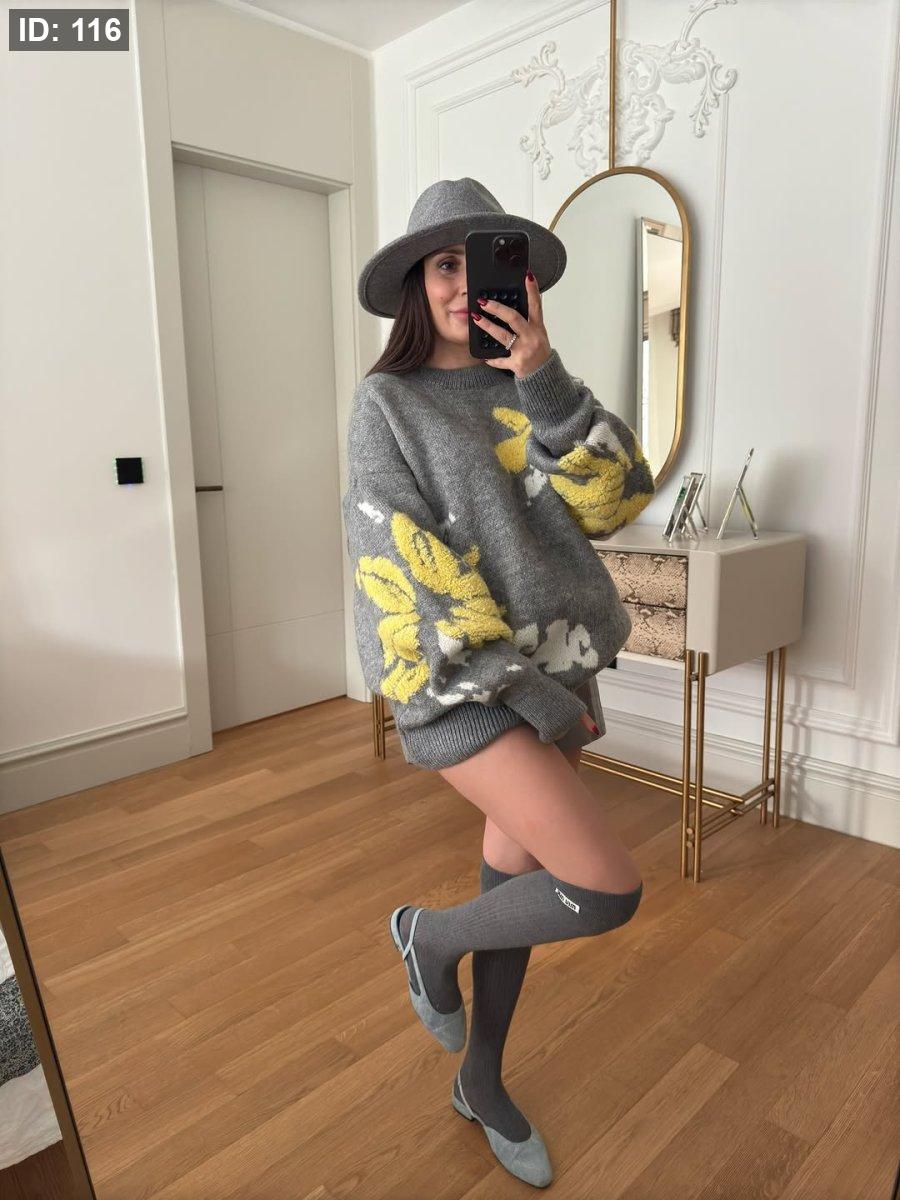 بلوزة صوف تقيلة بلون رمادي أنيق، مزينة بوردة ناعمة تجي مرّة باللون الأصفر ومرّة باللون الزهري. قصّتها مريحة ودافئة، مناسبة للأيام الباردة وتعطي لمسة أنثوية لطيفة على أي تنسيق.