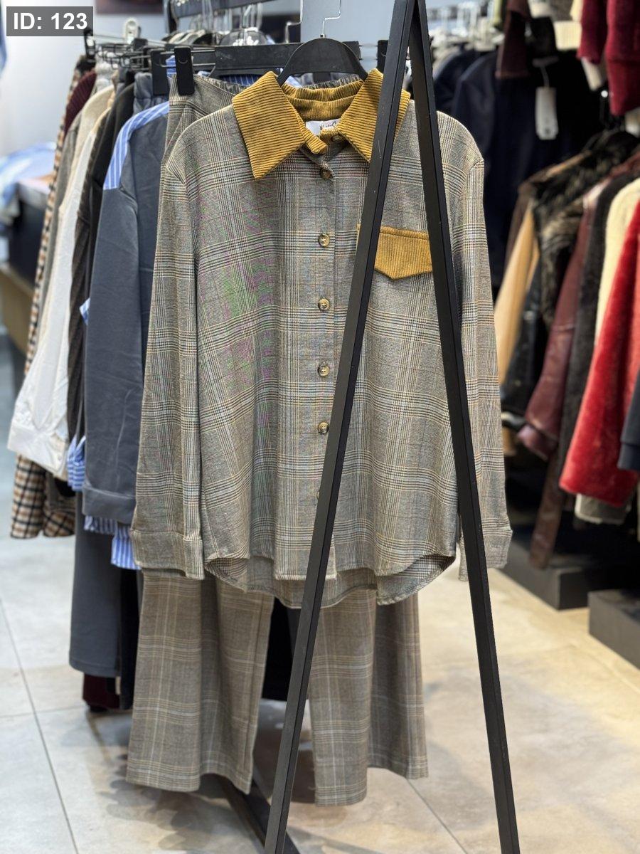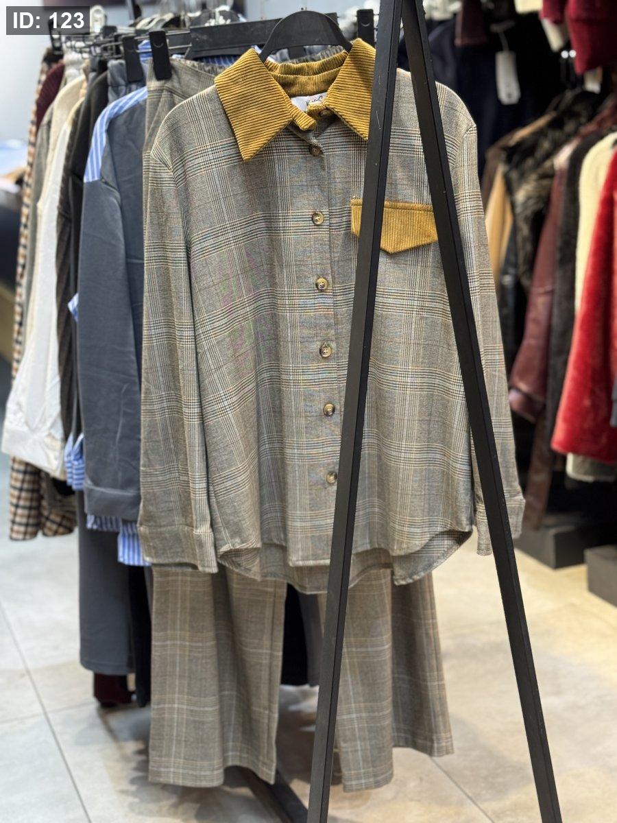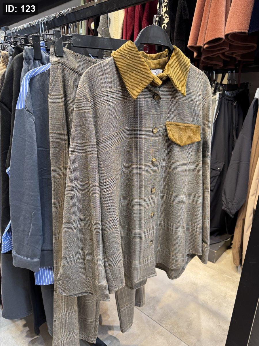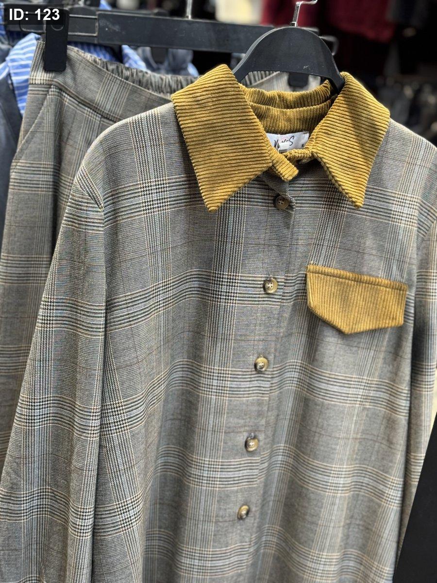 طقم كاروهات رمادي مع قبة عسلي أنيق وناعم، مناسب للشتاء وستايله راقٍ ومميز