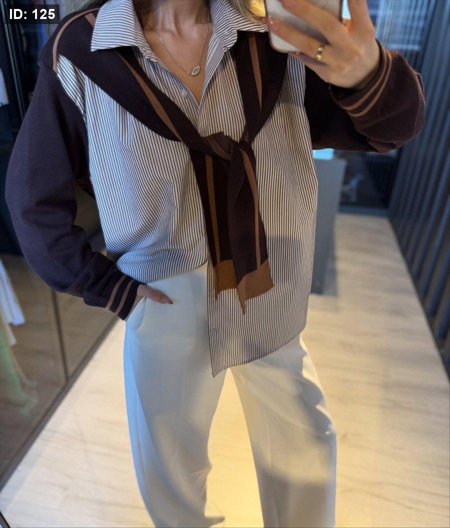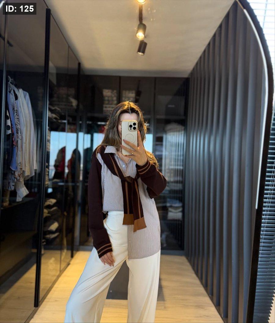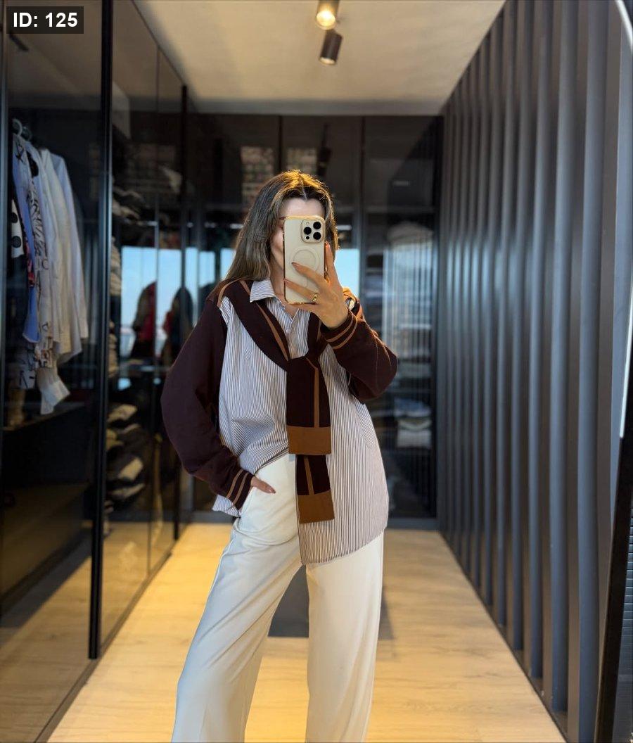 قميص مخطط خريفي مع لفحة، ستايل ناعم ومناسب لأجواء الخريف الدافئة