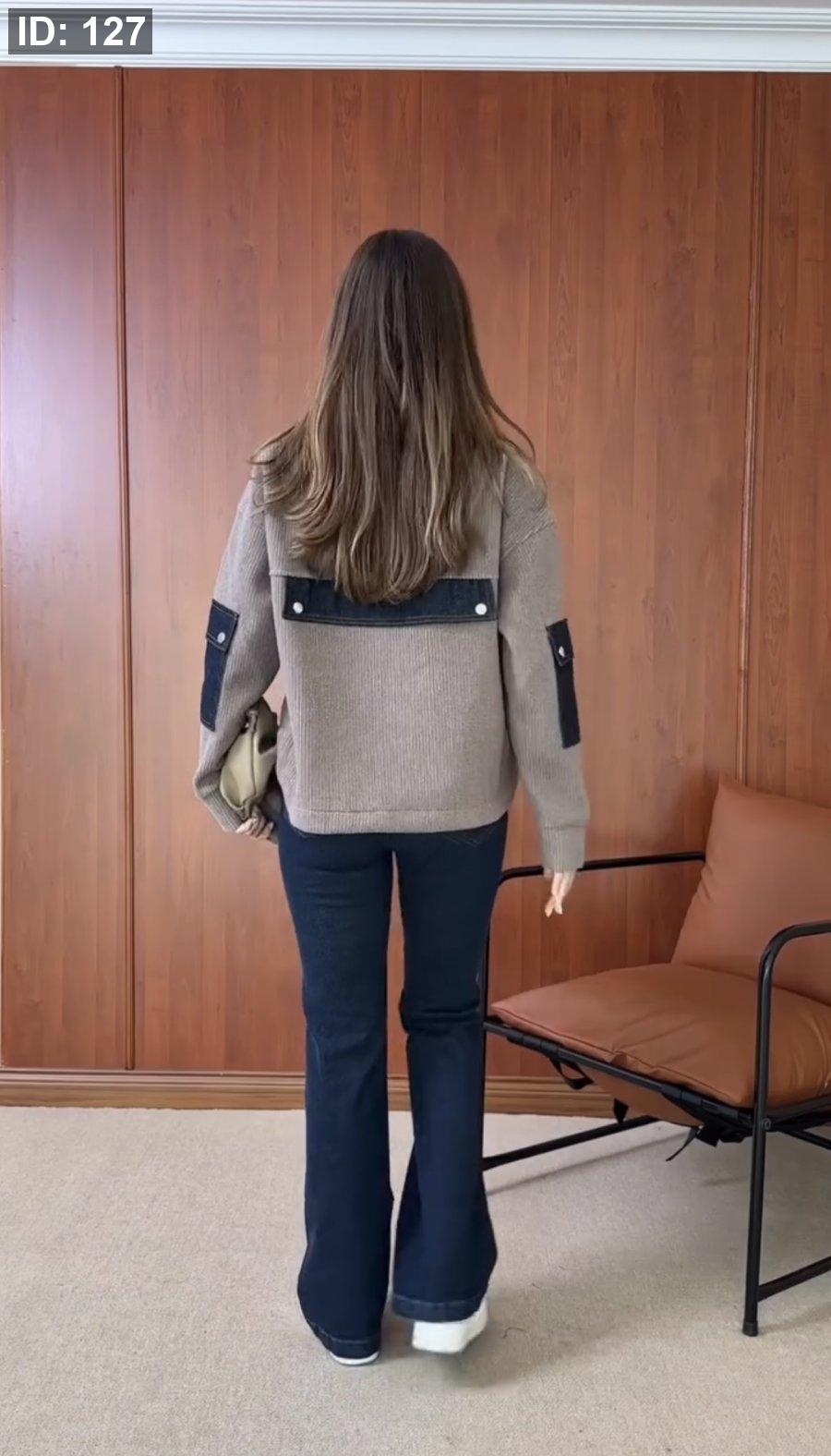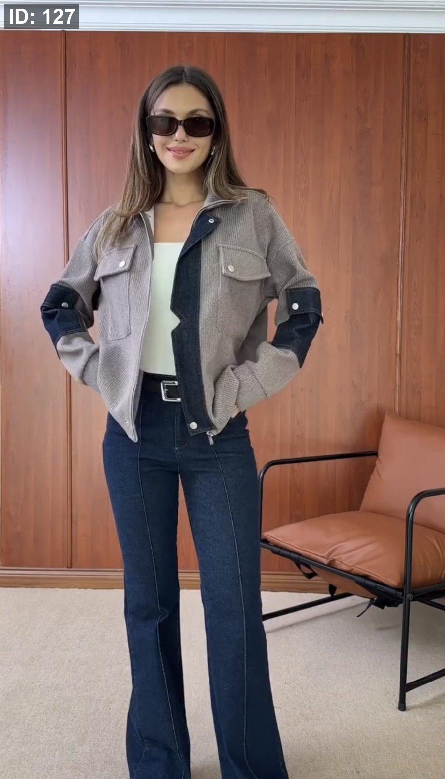 جاكيت تقيل وأنيق جدًا، ناعم ومريح مع لمسات خفية من الجينز على الأكمام وسحاب أمامي أنيق، دافئ ومثالي لأجواء الشتاء الباردة